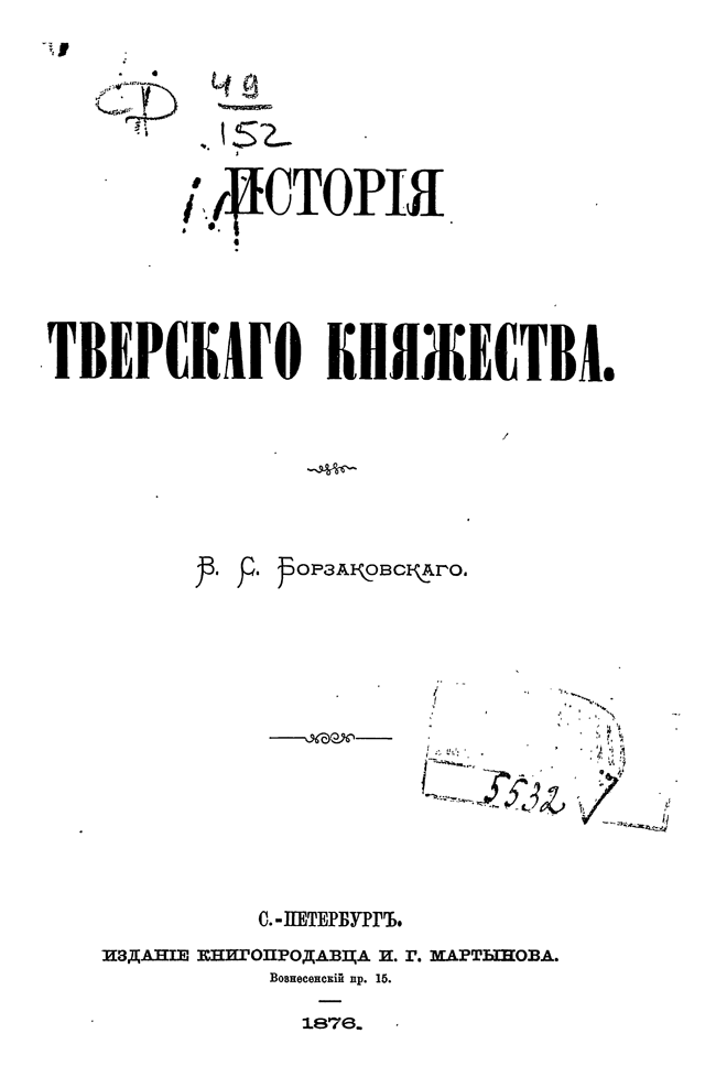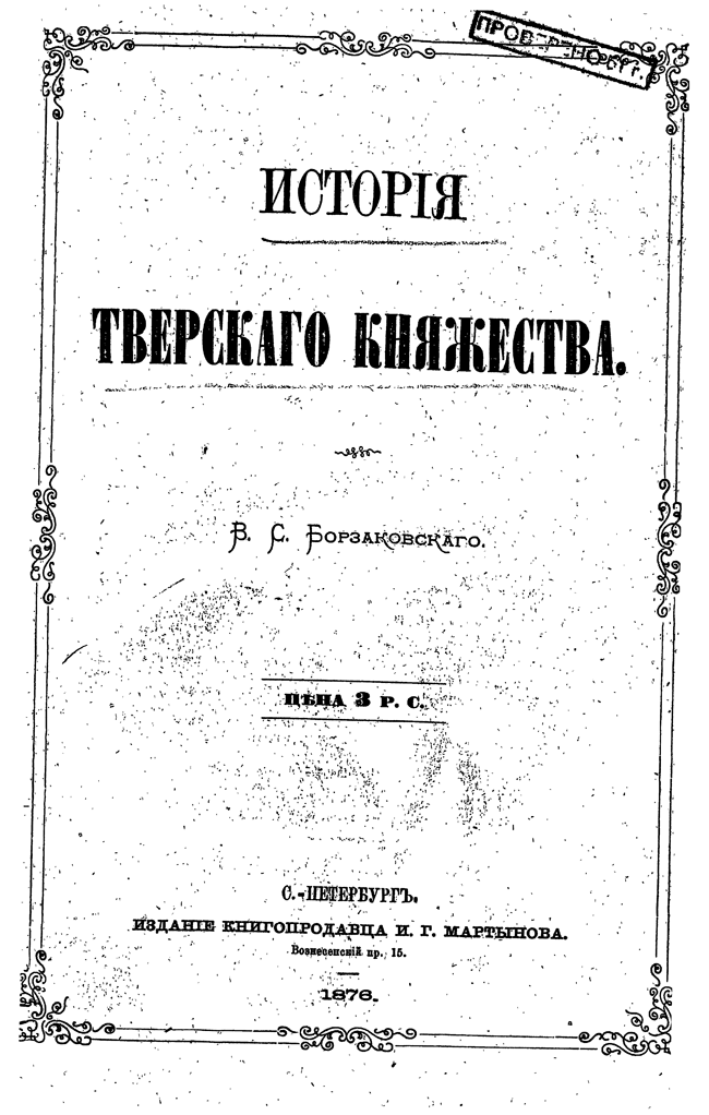 Капитальный труд, в котором даны исчерпывающие сведения по истории тверского княжества начиная со славянской колонизации верхнего Поволжья и заканчивая падением Твери. За свою работу Борзаковский получил степень магистра русской истории.