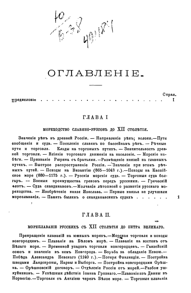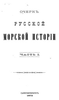 Первая часть «Очерка русской морской истории» содержит обзор морской деятельности России с древнейших времен до кончины Петра Великого. Автор работы, военно-морской историк Ф. Ф. Веселаго, задавался целью в сжатом виде представить за этот период истории главные черты русской морской деятельности.