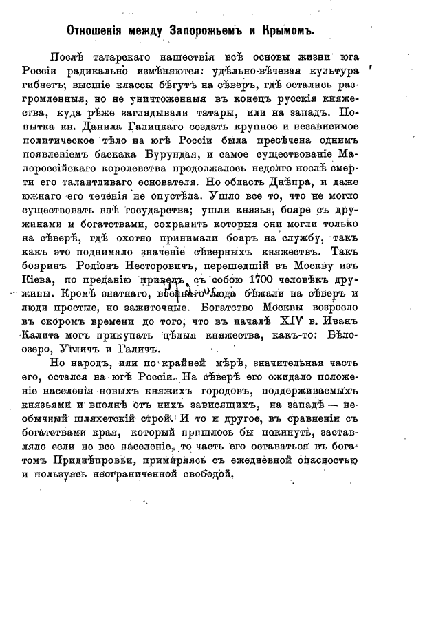 В книге «Отношенiя между Запорожьемъ и Крымомъ» повествуются об отношениях между Запорожьем и Крымом после татарского нашествия, факторах сближения (политических, экономических), также изложены с комметариями известия, сохранившиеся об этих отношениях.