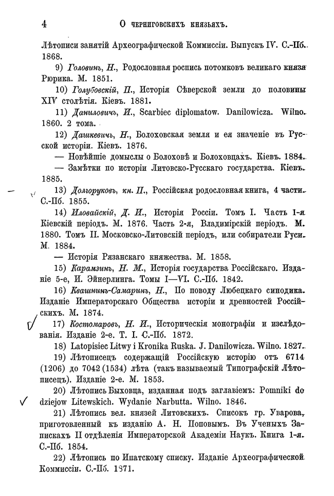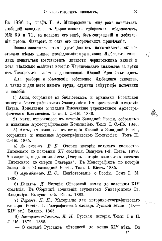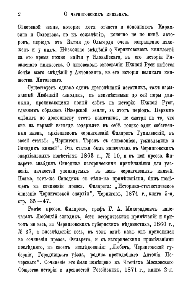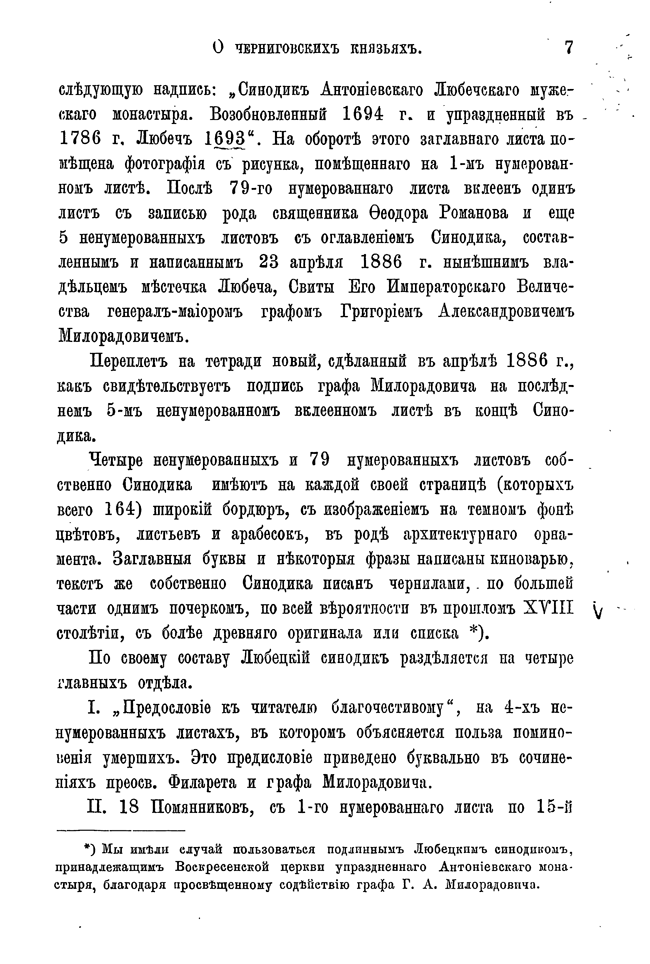 Автор, используя любецкий поминальный синодик, содержащий имена черниговских князей, попытался восстановить в отдельных деталях историю Черниговского княжества в период ига. Он откомментировал имена персон, упомянутых в синодике и сопоставил сведения о них с материалами, собранными Археографической комиссией.