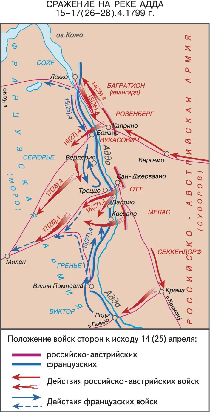 Французская армия растянулась на 100 км вдоль реки Адда, и ее фронт был прорван в нескольких местах при Ваприо, Кассано, Сан-Джервазио и Лоди. Суворов вместе с частью войска скрытно переправился через Адду в центре французских позиций (у Сан-Джервазио) и начал оттеснять французов от реки, преодолевая их упорное сопротивление. Другая часть войска переправилась в районе Кассано и зашла к французам в тыл. К вечеру 27 апреля началось отступление французской армии со всех позиций. После победы при Адде русскими войсками был взят Милан. Битва стала первой крупной победой союзников в ходе Итальянского похода Суворова.