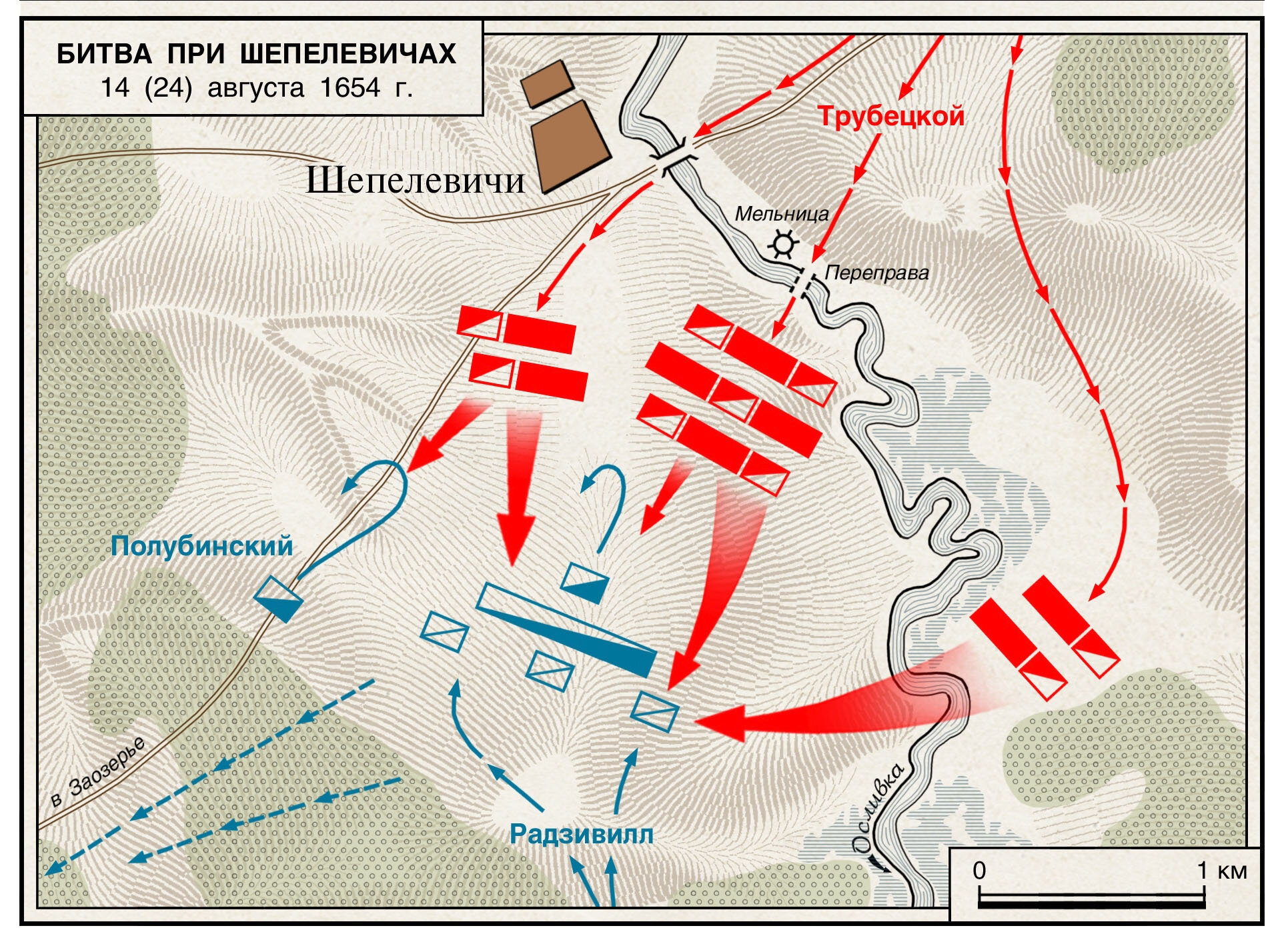 Схема сражения у села Шепелевичи 14 (24) августа 1654 года в ходе русско-польской войны 1654 — 1667 гг.