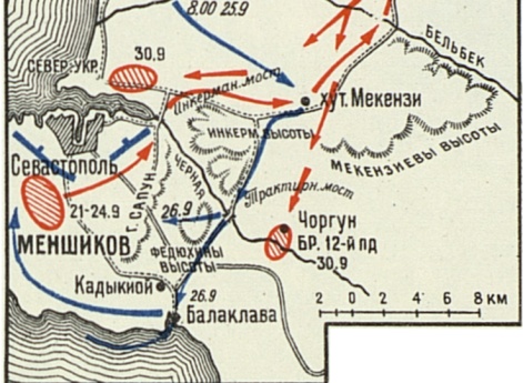 Командование объединенной англо-французской группировки предприняло высадку большого десанта в Евпатории (1–6 сентября). Русские войска во встречном сражении на р. Альма (8 сентября) потерпели поражение. Началась осада Севастополя (28 сентября). Город подвергся массированной бомбардировке (5 октября). Гарнизон Севастополя вылазками и контратаками сдерживал продвижение противника. Основные силы русской армии находились к северу и востоку от города, поддерживая его оборону. С целью деблокирования Севастополя русские войска атаковали позиции противника у Балаклавы (13 октября), но не достигли своих целей. 24 октября 1854 г. русские войска под Инкерманом предприняли попытку вновь разгромить союзные войска, сорвав тем самым намечавшийся штурм Севастополя, но вновь потерпели неудачу. Вместе с тем штурм Севастополя не состоялся в намеченные союзным командованием сроки.