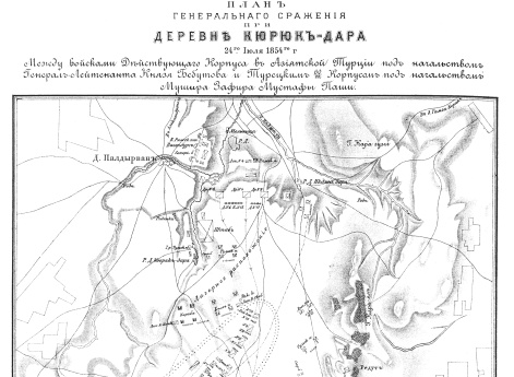 План генерального сражения при деревне Кюрюк-Дара 24 июля 1854 года. Между войсками Действующего Корпуса в Азиатской Турции под начальством Генерал-лейтенанта Князя Бебутова и Турецким 60-ти тысячным Корпусом под начальством Мушира Зафира Мустафы Паши