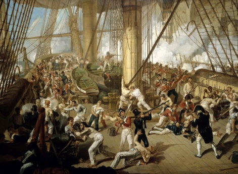Действия на море, 1805 г.В Атлантике и на Средиземном море основные силы французского флота базировались в Бресте и Тулоне. Наполеон планировал соединить средиземноморскую эскадру французского флота с испанским флотом и совместными силами прорвать английскую морскую блокаду у побережья Испании. Это позволило бы французским и испанским военно-морским силам вернуть контроль над коммуникациями с американскими колониями, а затем – деблокировать Брест и вытеснить английский флот из Ла-Манша для дальнейшей высадки французского десанта в Англии. Но ход военных действий в южной Германии и Италии в 1805 г. изменил эти планы. Наполеон приказал соединённым силам французского и испанского флотов (адмирал Вильнёв) выйти из Кадиса, атаковать англичан, а затем – идти в Средиземное море с тем, чтобы поддержать действия французских войск в Италии. Тем временем в конце октября 1805 г. адмирал Г. Нельсон принял командование над британскими эскадрами в районе испанского Кадиса и 21 октября разгромил при Трафальгаре вышедший в море соединённый франко-испанский флот. Гибель самого адмирала Нельсона в сражении не остановила победу англичан. После Трафальгара военно-морское превосходство Великобритании на море над наполеоновской Францией стало неоспоримым.