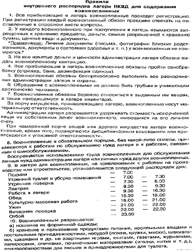 «ПРАВИЛА ВНУТРЕННЕГО РАСПОРЯДКА ЛАГЕРЯ НКВД СССР ДЛЯ СОДЕРЖАНИЯ ВОЕННОПЛЕННЫХ» Воспр. по: Катынь. Пленники необъявленной войны. Документы и материалы. / Под редакцией Р. Г. Пихои, А. Хейштора.
