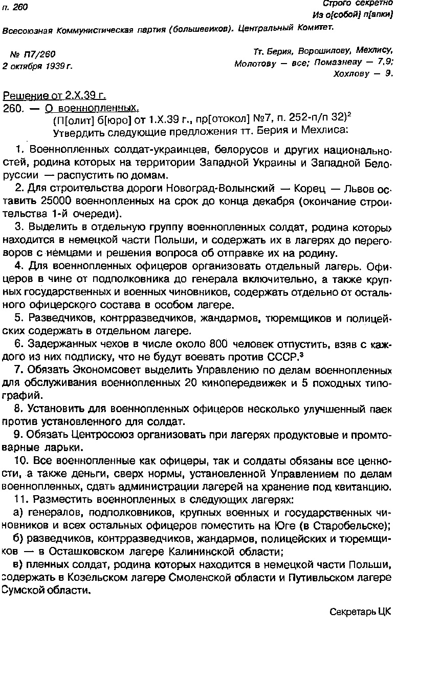 1939 год, 2 октября По предложению Берии все военнопленные были разделены на несколько категорий: часть отпущено, часть направлена на строительные работы, некоторые должны ожидать решения своей участи в лагере.