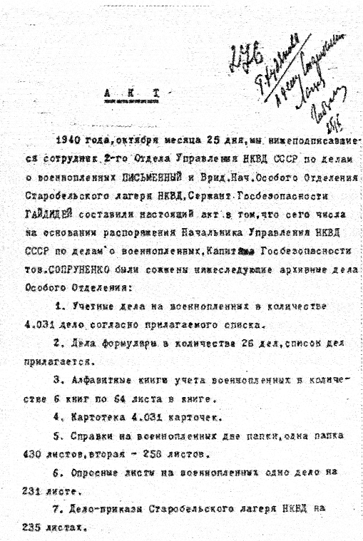 1940 год, 25 октября Акт уничтожения архивных дел выбывших военнопленных Старобельского лагеря путем сожжения.