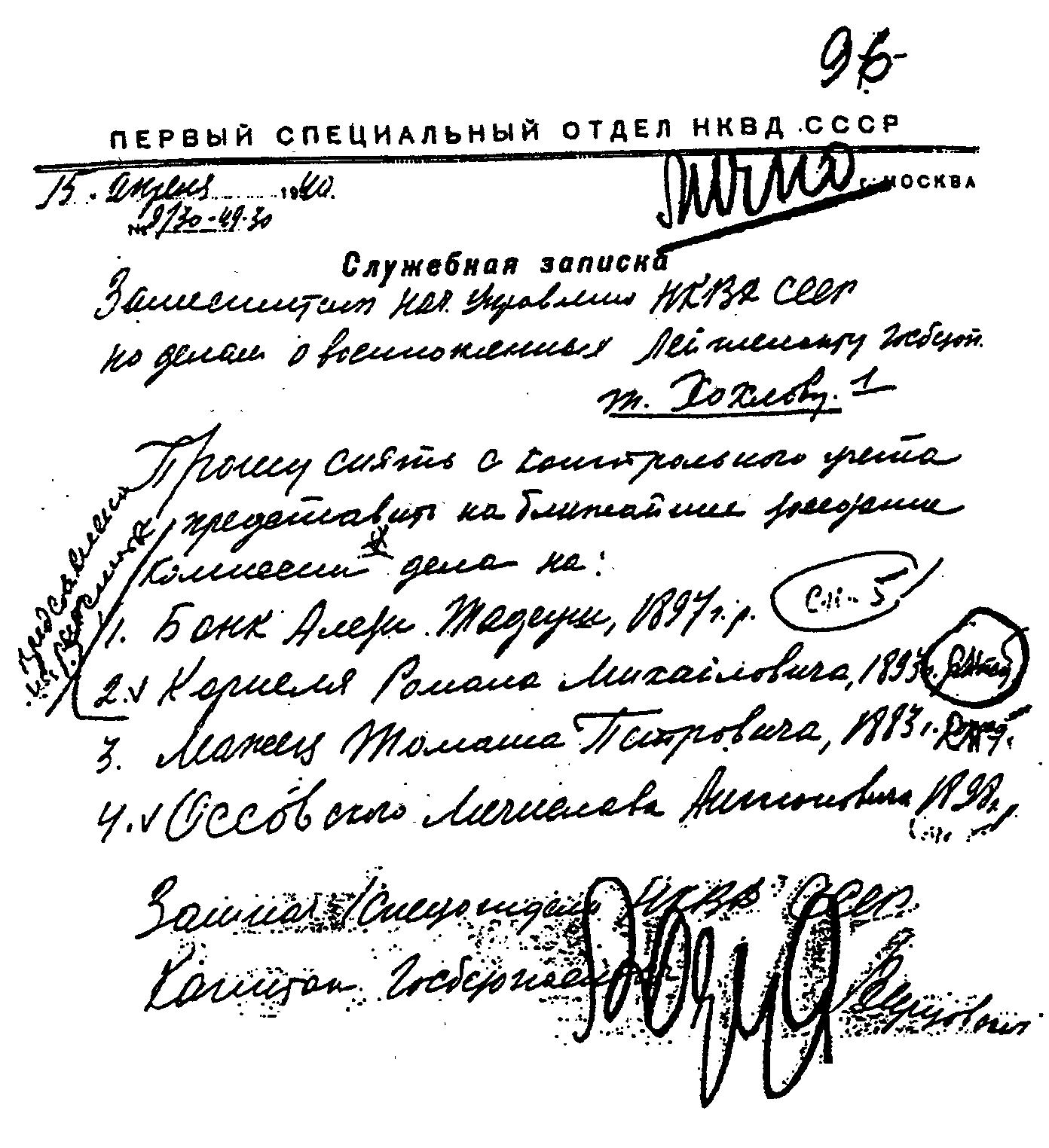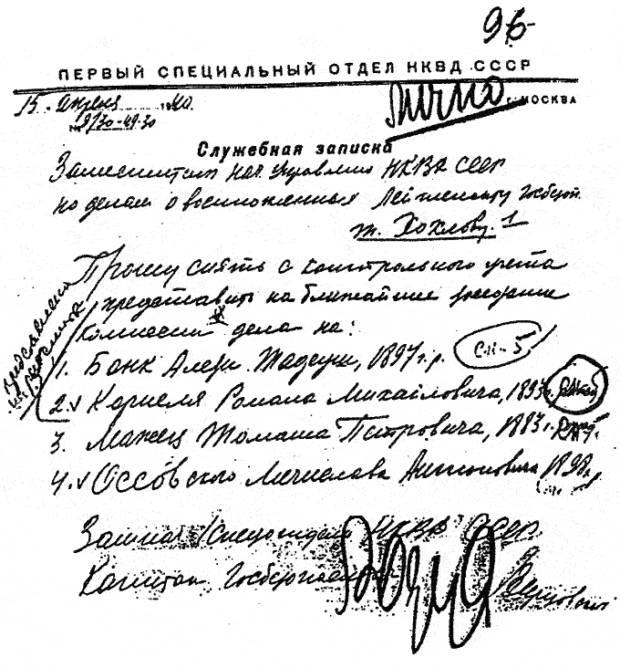 1940 год, 10 апреля Служебная записка А. Я. Герцовского И. И. Хохлову о снятии с контрольного учёта дел на польских военнопленных А. Бонка, Р. Корнеля, Т. Мажеца, М. Оссовского.