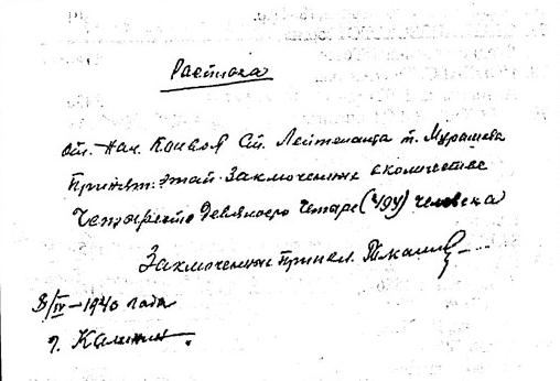 1940 год, 8 апреля Расписка о принятии польских военнопленных от конвоя в количестве 494 человека в Калининское УНКВД.