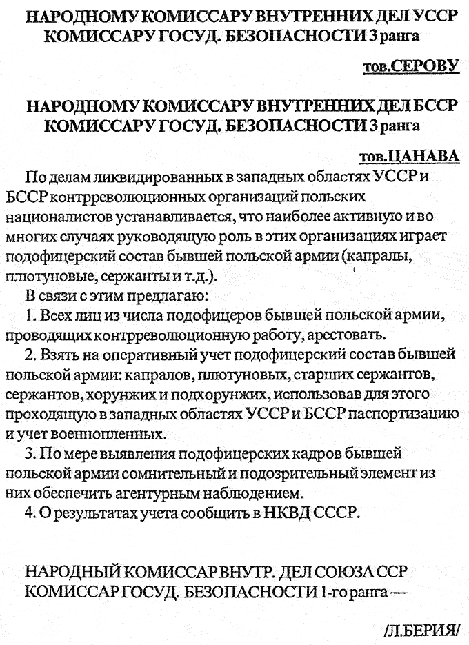 1940 год, 4 марта В распоряжении Л. П. Берии наркомам Серову и Цанаве дается указание выявить подофицерский состав (капралов, сержантов, хорунжих и др.) среди военнопленных, в случае проведения ими контрреволюционной работы подвергнуть, а для подозрительных установить агентурное наблюдение.