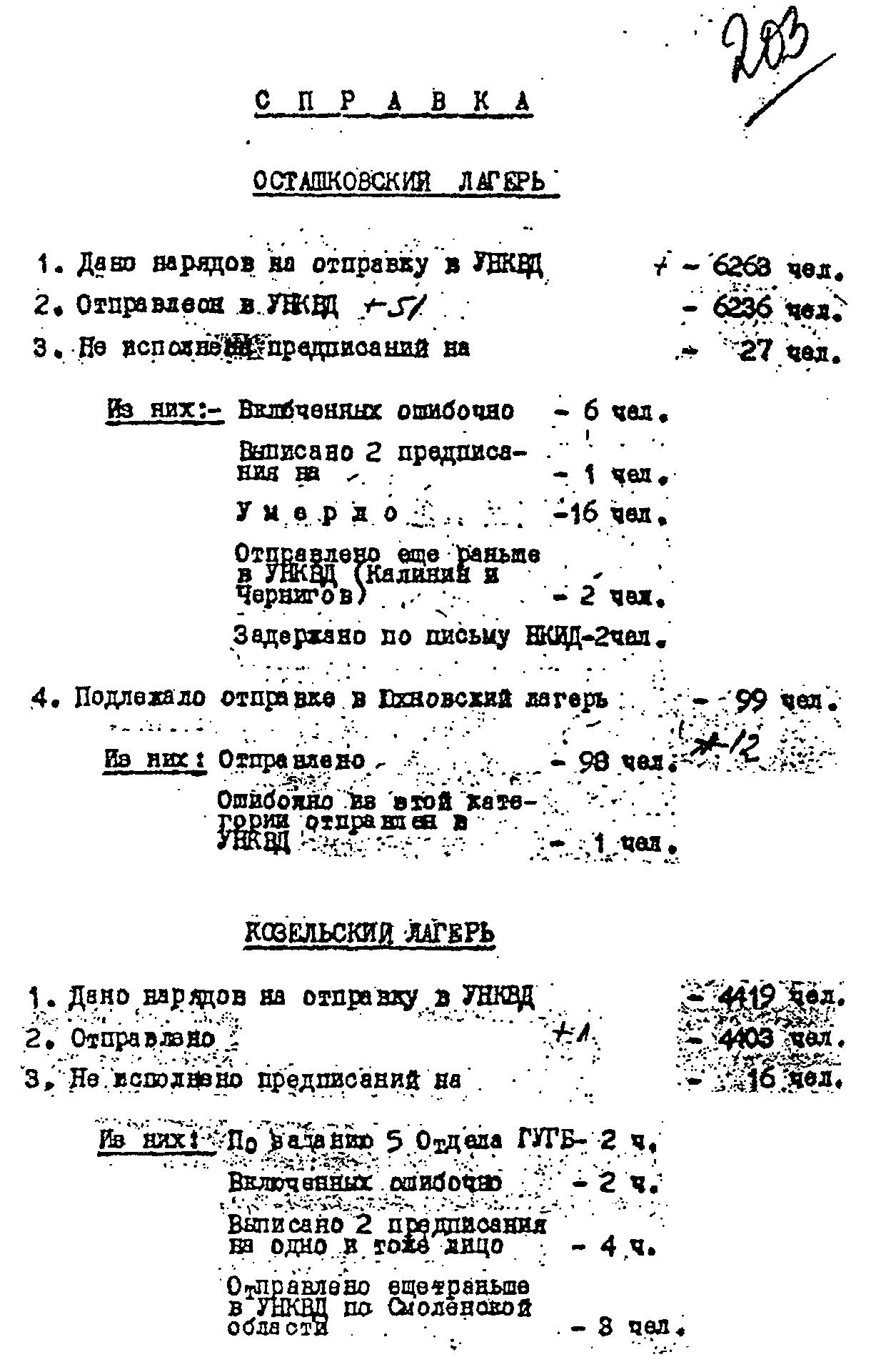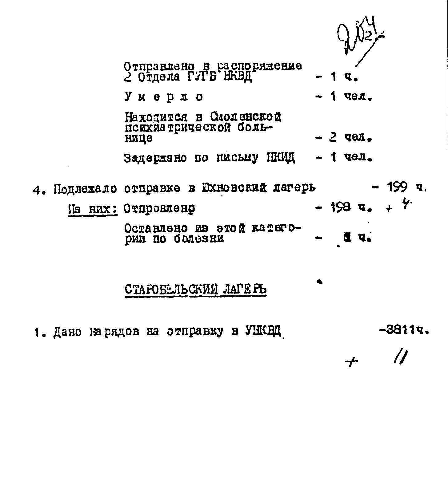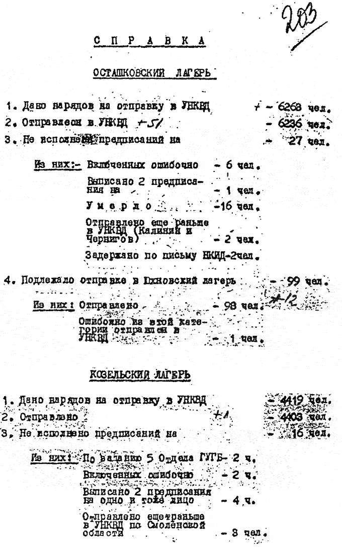 1940 год, не ранее 19 мая Справка об исполнении нарядов на отправку польских военнопленных их спецлагерей в распоряжение УНКВД соответствующих областей.
