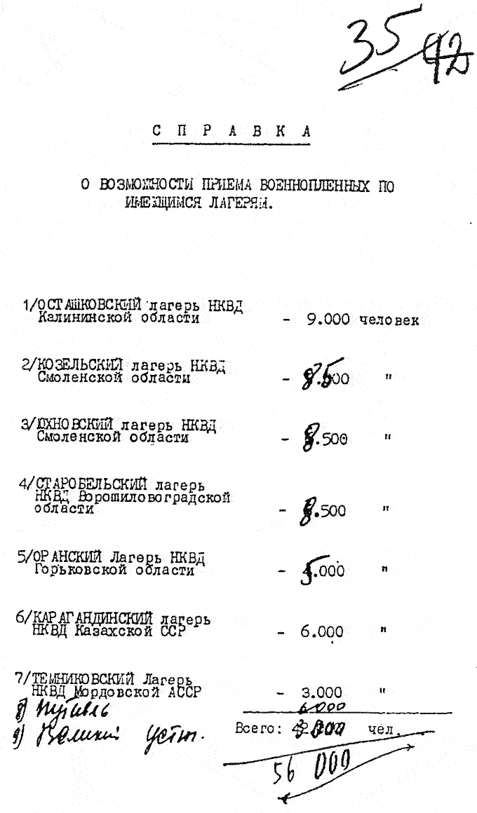 1940 год, не ранее 9 июня Справка П. К. Сопруненко о возможности приема военнопленных спецлагерями НКВД СССР.