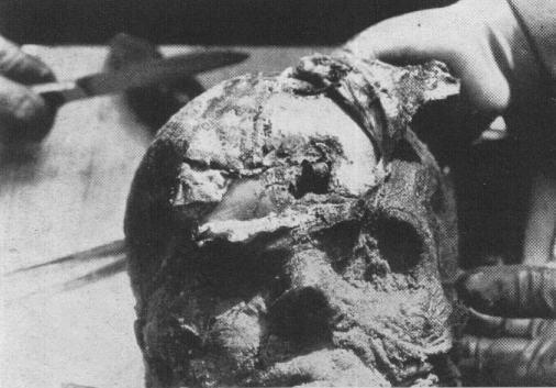 Череп убитого с выходным отверстием во лбу.