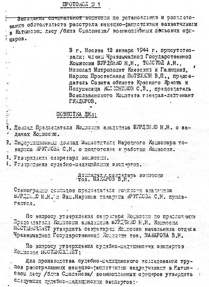 1944 год, 13 января Протокол заседания специальной комиссии по установлению и расследованию обстоятельств расстрелов немецко-фашистскими захватчиками в Катынском лесу военнопленных польских офицеров.