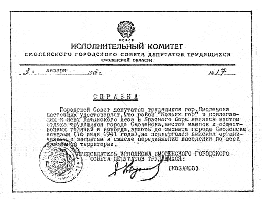 1944 год, 3 января Справка исполнительного комитета Смоленской области удостоверяющая, что район «Козьих гор» и прилегающего к нему Катынского леса являлся местом отдыха трудящихся вплоть до лета 1941 года.