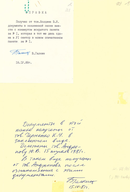 Папка-двулистка и справка сотрудника I сектора Общего отдела ЦК КПСС В.Е. Галкина об ознакомлении руководителей ЦК КПСС с документами пакета 1.
