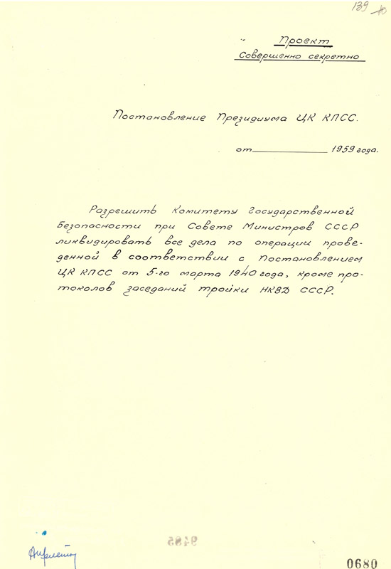 Записка председателя КГБ при СМ СССР А.Н. Шелепина Н.С. Хрущеву о ликвидации всех учетных дел на польских граждан, расстрелянных в 1940 г. с приложением проекта постановления Президиума ЦК КПСС.