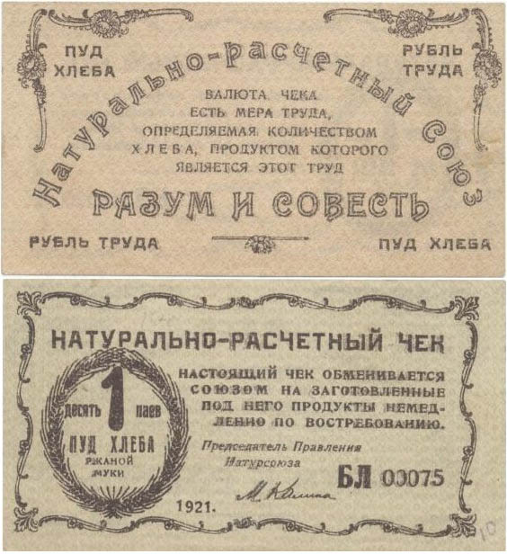 Увы, население приобретать чеки не спешило, в результате до нашего времени дошло буквально несколько бон Натурсоюза и пригоршня токенов, правда, популярностью они не пользуюся, так что стоят (токены, по крайней мере) в пределах 40-50 тыс. рублей. На заграничных аукционах не замечены. Вообще это довольно досадно, так как Натурсоюз имел небанальную концепцию, радикально отличающуюся от обычных кооперативных чеков, которые в те годы печатали все, кому не лень (в силу обесценивщихся денег). В тривиальном случае чеки выдавались конкретным, допустим, заводом за работу (потому что оплатить ее государственными деньгами возможности не было) и не шли дальше, отовариваясь тут же в заводском магазине товарами, которые как-то удалось раздобыть. Собственно, служили они только цели учета и упорядочивания работы за еду. Натурсоюз имел более идеалистическую цель - по его мнению, каждый крестьянин или рабочий (а иных в светлом мирк утопического социализма и не должно быть) вкладывал свой труд в общее дело: крестьянин растил хлеб, рабочий работал на заводе, затем же они буквально менялись результатами труда посредством натурчеков обеспеченных пудами ржаной муки. Концепция была феерической, не удивительно, что она не взлетела, но подход к денежной теории к Калины был в равной мере и архаичный и утопически-передовой. Не каждый день изобретаются (и физически внедряются!) альтернативные денежные системы.