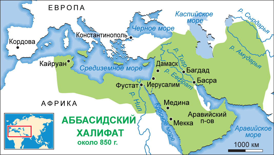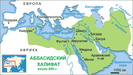 Начало разложению его было положено в Испании, где Абд-ар-Рахман, один из представителей низложенной династии Омейядов, был признан независимым государем в 755 (138) г.; этим здесь навсегда был положен конец владычеству Аббасидов. 30 лет спустя Идрис, правнук халифа Али и потому одинаково враждебный Аббасидам и Омейядам, основал алидскую династию в Марокко, столицей которой был город Тудга, в 788 (172) г. Остальная часть северного берега Африки была фактически потеряна для халифов, когда аглабидские наместники утвердили свое владычество в Кайруване в 800 (184) г. В следующем столетии отделился Египет, вместе с Сирией, под властью Ибн-Тулуна, в 877 (264) г. Правда, после падения Тулунидов в течение 30 лет Сирия и Египет снова находились в руках аббасидских наместников; но в 934 (323) г. Ихшид основал свою династию, и с тех пор ни одна область к западу от Евфрата не подчинялась светской власти багдадских халифов, хотя их права духовных владык признавались повсюду, кроме Испании и Марокко; с их именем чеканилась монета и читалась общественная молитва (хутба).