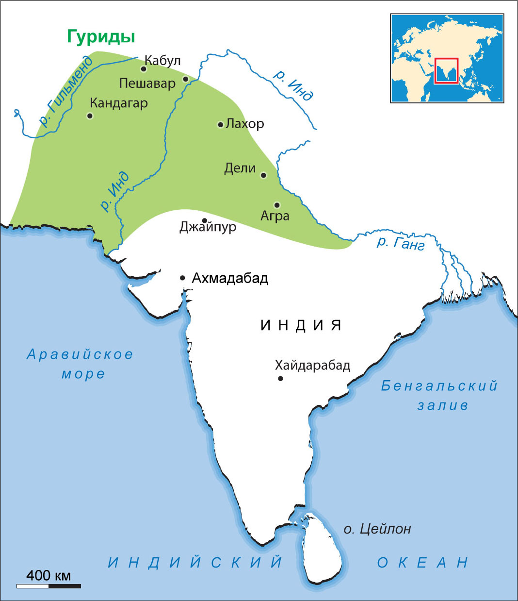 отнял у сельджуков часть Хорасана; затем начинается ряд походов на Индию, приведший к завоеванию Синда и Мультана (571 г.), где уже арабские наместники приучили народ к мусульманскому правлению. Мухаммед Гури в 1186 (582) г. подчинил себе Лагор, последнее убежище Газневидов; после этого он решил произвести нападение на главу чоханраджпутов, раджу Притви аджмирского. Его первое нападение было отбито со страшными потерями (587 г.), но в следующем, 1192 г. упорная битва на том же месте, в Танесваре, окончилась полным поражением раджпутов, причем пал сам раджа Притви и многие другие из 150 князей, собравшихся для защиты Индустана. Следствием победы было подчинение почти всей северной Индии, так как в 1194 г. пал Канаудж; области Гвалиор, Бандалханд, Бихар и Бенгалия одна за другой были покорены военачальниками Мухаммеда Гури. В первый раз весь Индустан подчинился, в большей или меньшей степени, власти мусульман.