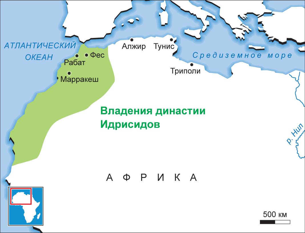 Идрисиды, арабская шиитская династия, правившая в Марокко в 789—985 гг. Основана потомком Фатимы (дочери пророка Мухаммада и Али) Идрисом I ибн Абдаллахом (789—791). При поддержке берберским племен он создал в 788 г. эмират (имамат) с центром в г. Улили (Волюбилис), при его сыне Идрисе II (803—828) столица была перенесена в Фес. Слабость центральной власти привела к распаду эмирата Идрисидов на удельные княжества при Мухаммаде аль-Мустансире (828–836). В первой половине X в. Идрисиды признали верховную власть Фатимидов. Неоднократно подвергались нападениям Испанских Омейядов. Родственные Идрисидам Хаммудиды правили в Малаге (1014/1015 – 1056).