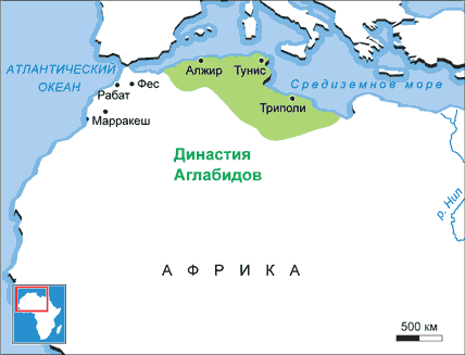 «Ибрагим б. Аглаб управлял от имени халифа провинцией Заб во время смут, наступивших после смерти африканского наместника Язида в 787 (170) г. Харун-ар-Рашид в 800 (184) г. назначил Ибрагима наместником всей африканской провинции; но он не стал оспаривать у Идрисидов господства над отдаленным западом. Его династия была фактически независима; даже религиозный авторитет халифов Аглабиды редко признавали настолько, чтобы выбивать монеты с их именами. Они не только были просвещенными и энергичными правителями на суше, но также владели большим флотом на Средиземном море, опустошали берега Италии, Франции, Корсики и Сардинии и завоевали Сицилию (между 827 и 878 гг.); остров остался в руках мусульман до норманнского завоевания. Время наибольшего процветания аглабидской династии было периодом величайшего могущества арабов на Средиземном море; их пираты были предметом ужаса для кораблей; кроме Сицилии они захватили Мальту и Сардинию и даже нападали на предместья Рима. Однако неспособность позднейших аглабидских государей и усиление мятежных сектантов, встречавших поддержку со стороны шиитских Идриси-дов на западе, подготовили торжество Фатимидов в 909 (296) г.»